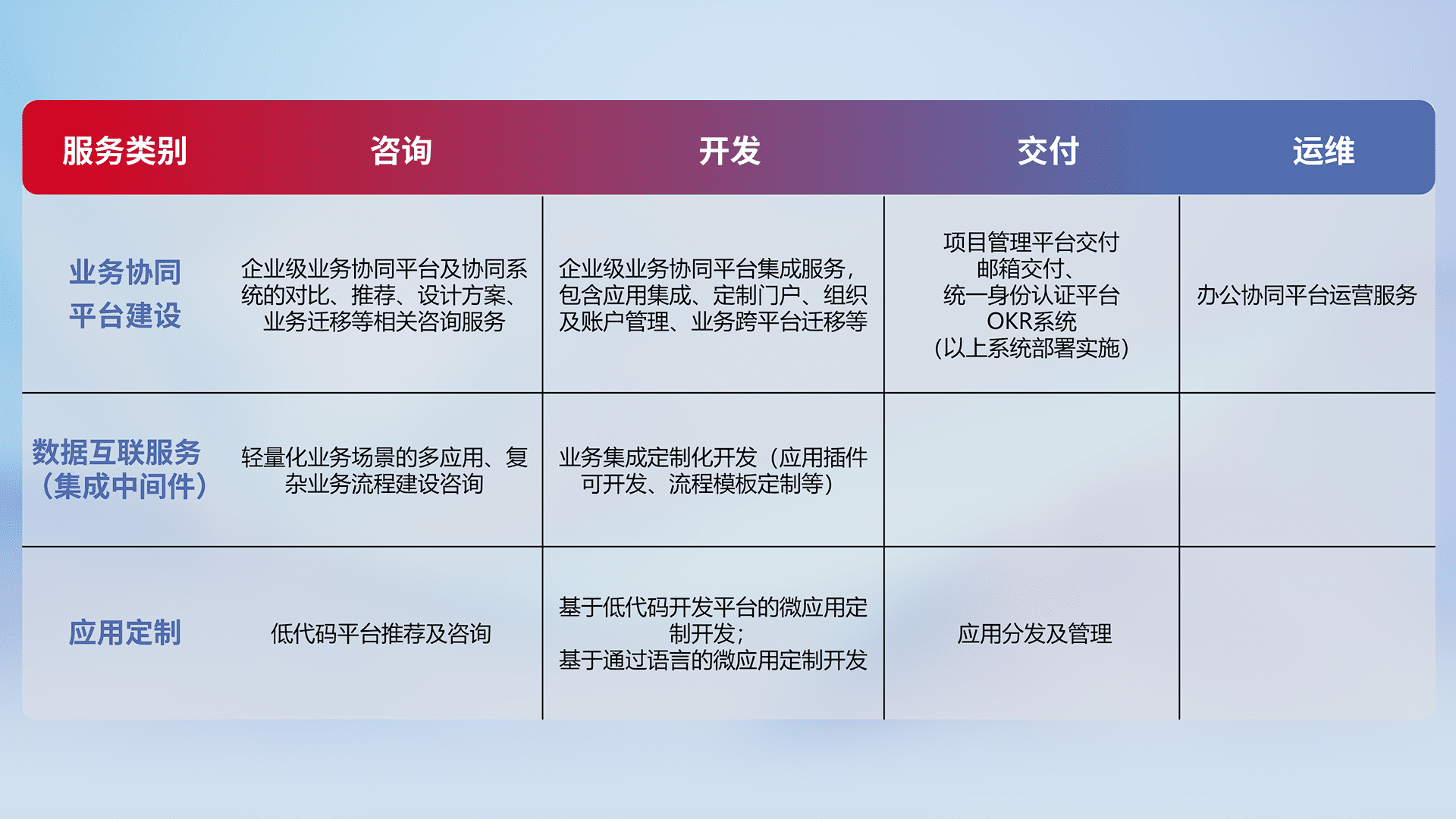针对钉钉、、、、企微、、IDaas等平台级产品提供产品的规划、、、、方案、、、交付、、定制化开发等服务,,实现如统一协同办公、、、、智能客户服务、、、、混合会议管理、、、、智能数据查询、、、、等业务场景,,实现数字化转型。。。